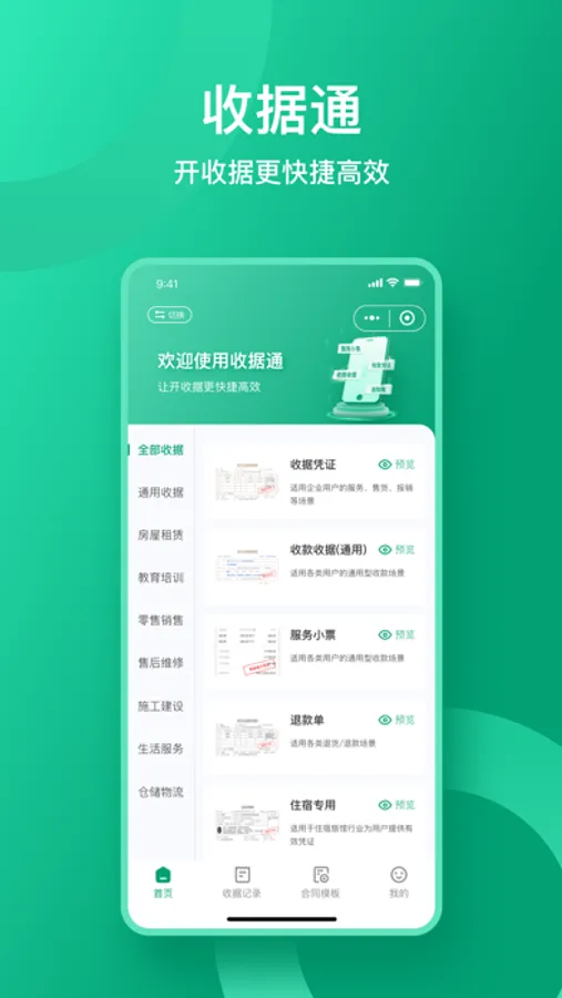 具有通用收据、房屋租赁、教育培训、零售销售、售后维修、施工建设、生活服务、仓储物流等8种收据种类,帮助用户开具20+种类型收据模板。能够实时追踪欠款信息,查看收据详情,发送给客户,支持收据数据导出等功能。轻松快速地开出符合行业标准的各类收据,能够上传营业执照生成公章、自定义水印文字样式、个人名称、支持商标logo设置,让收据更具个性化和专业性,开收据开具变得更加高效、准确、方便。