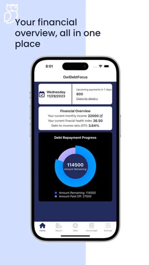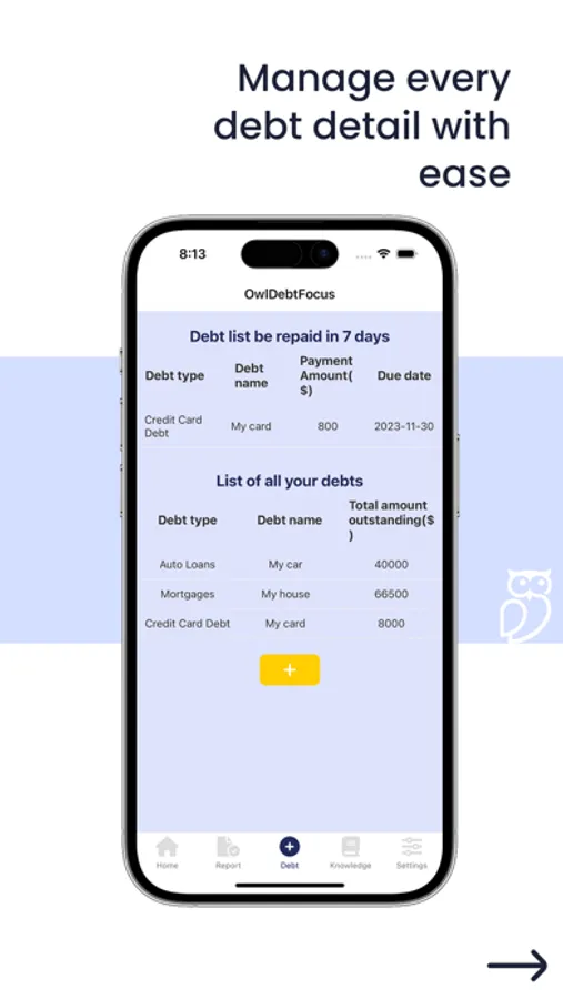 Take control of your debts and pave your way to financial stability with Owl Debt Focus! Our meticulously designed app empowers you to take control of your debts, providing a clear picture of your financial health and actionable strategies to manage and reduce your debts efficiently.