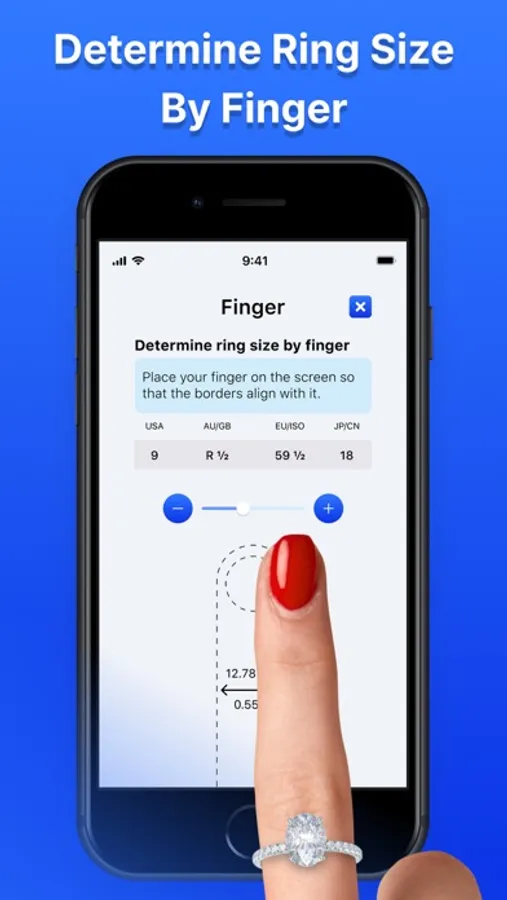 Ring-on-Screen: Place your ring on the screen within a designated circle to measure its diameter. The app displays sizes in four different regional standards: USA, AU/GB, EU/ISO, and JP/CH.