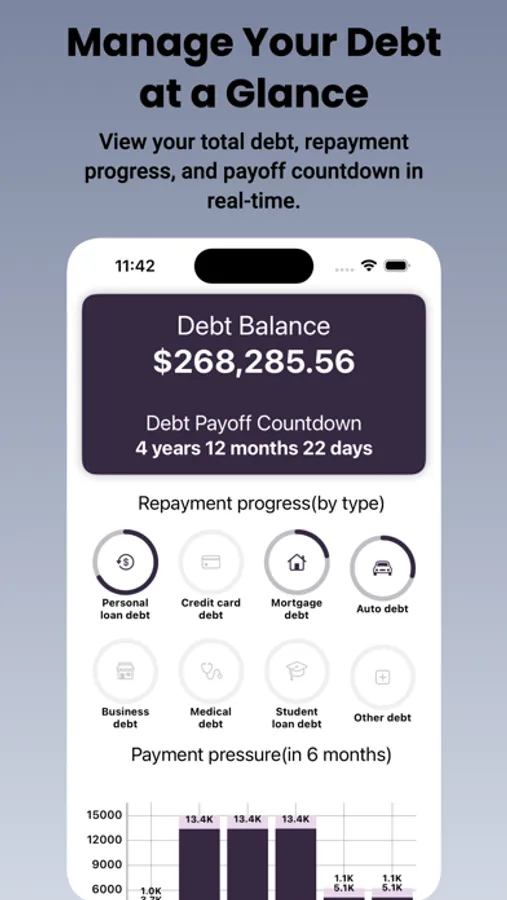 - Visualize your debt balance and payoff countdown prominently.
