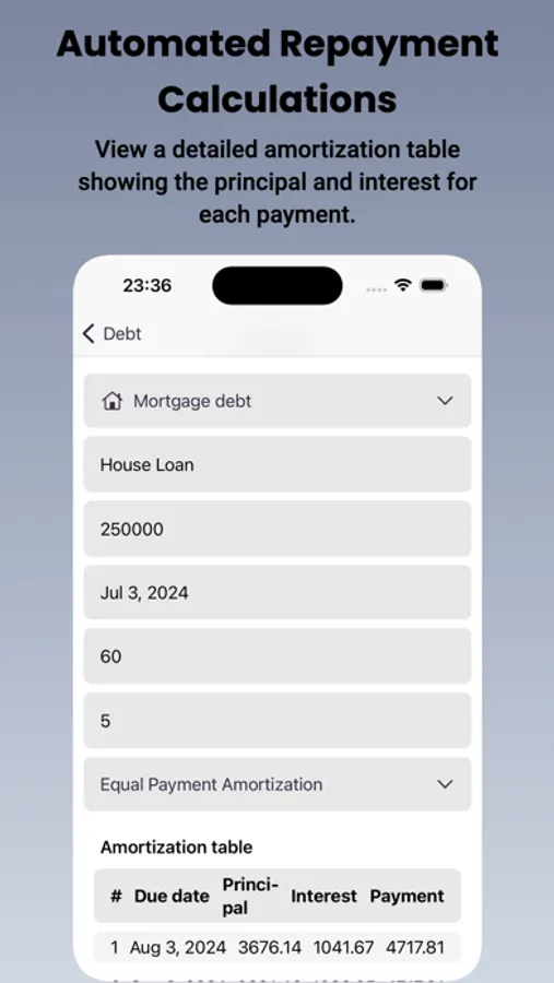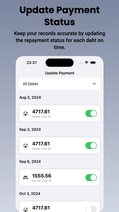 - View detailed repayment progress for different debt types (e.g., credit card, mortgage, personal loan).