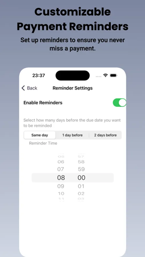 - Customize your app settings, including enabling reminders and setting reminder times.