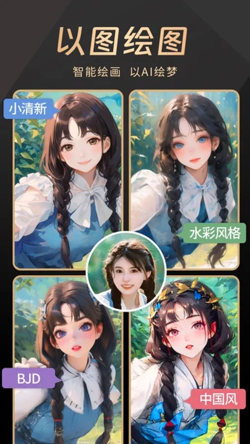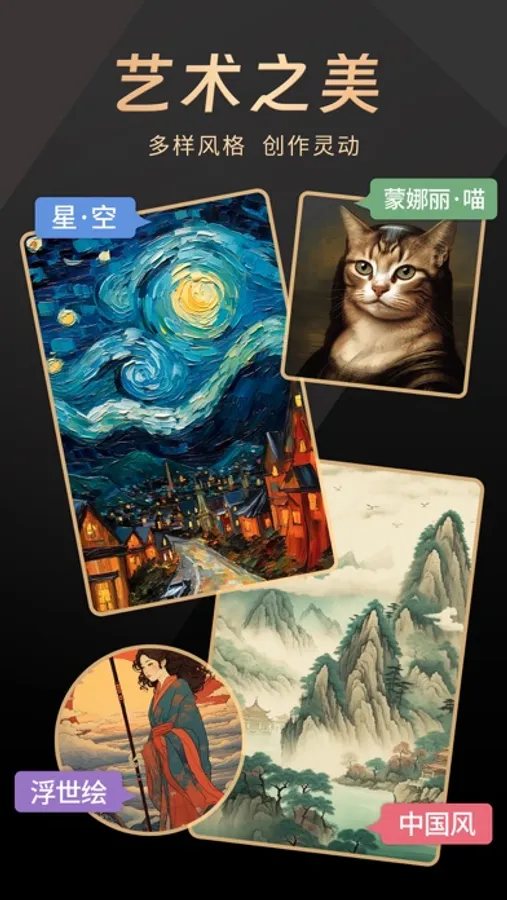 • 一键生成多风格艺术作品,从动画、到3D卡通,再到中国画、素描、油画等,多种风格任意选择。