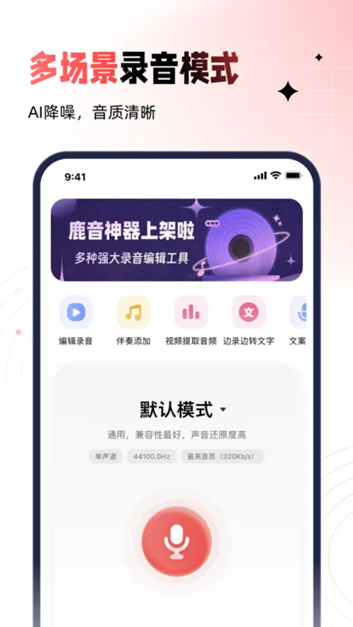 鹿音神器是一款专业的录音机app,提供多场景录音、实时录音转文字、文字背景音乐、音频剪辑、智能文字转语音配音、格式转换等功能。是一款非常棒的手机录音软件,是朗读文章,培训录音,学习笔记、课堂讲座、采访录音、会议记录、日常记事等的录音好帮手
