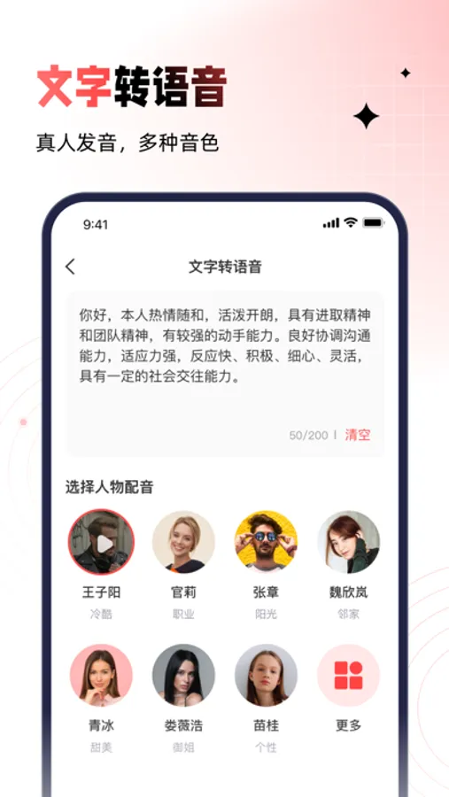 - 真人变声:将声音变换为指定人声,男女音色随意切换。