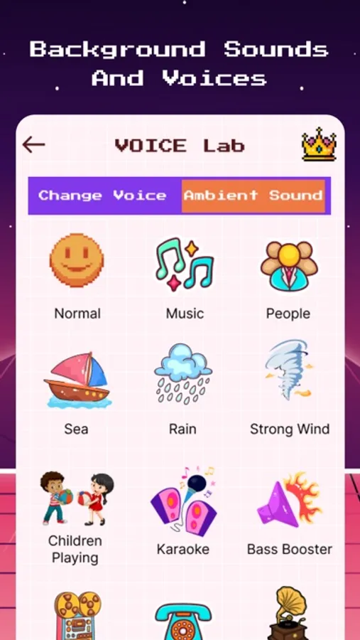 We have added commonly used and demanding sound effects as background voice. Record or insert your voice first, go to the tab of background sounds, and apply your desired bg sound effect. For example, if you are at home and your friend is calling you to chill out, you can record your voice that you are busy in the office and apply office noise bg sound to your voice and send it to your friend.