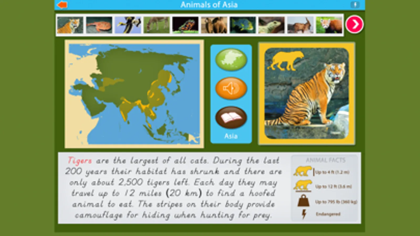 Touch an animal in the photo-strip to change the featured animal on the page. Touch the Map button to see the animal's habitat highlighted on the map. Touch the Speaker button to hear the correct pronunciation of the animal name. Touch the Definition button to see and hear a detailed description of the animal as well as the Animal Facts box, containing dimensions, weight and conservation information. A list of Conservation definitions can be seen by touching the button on the top bar.