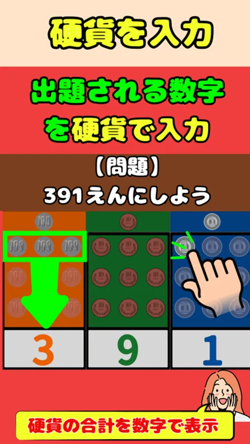 2. Problem-Solving: Automatically generates problems up to 999 yen, allowing children to practice making exact change.