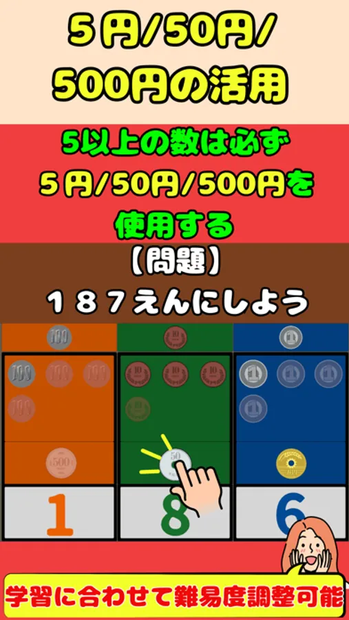 3. Coin Switching: Problems include using 5, 50, and 500 yen coins, enhancing visual learning.