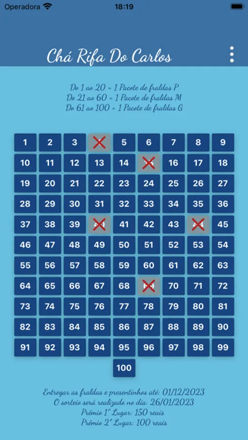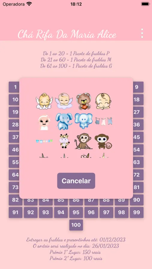 Com nosso aplicativo, você pode definir o(s) prêmio(s), data de sorteio, nome e sexo do bebê e ainda é possível realizar o sorteio, do qual irão participar os números definidos como "pago" na lista de números escolhidos.
