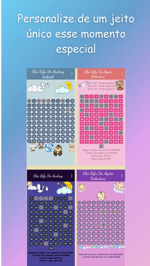 Baixe nosso aplicativo agora e descubra como ele pode tornar a organização do seu chá rifa ainda mais emocionante e prático. Este é o toque especial que seu evento merece, e estamos ansiosos para ajudá-lo a celebrar a chegada do seu bebê de maneira inesquecível!