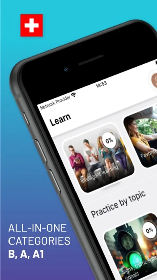 Use our app to prepare yourself optimally for the car and motorcycle theory test (category A, A1 and B) in Switzerland, so that you can easily receive your learner's license in 2025 and your permanent driver's license soon afterwards.