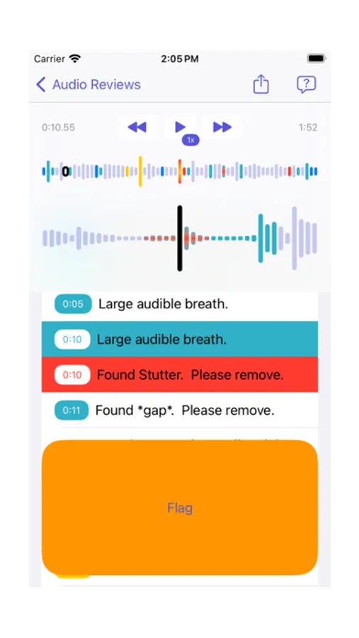 Simply load up any audio file, play it in our player (which allows for 1x, 0.5x, and 2x speeds), and just press the big "flag" button whenever you catch an issue. Tap one of the presets or type your own custom message. We have presets for common issues like gaps, “um,” "uh," “and,” "like", breaths, stutters, smacks, and sync issues.