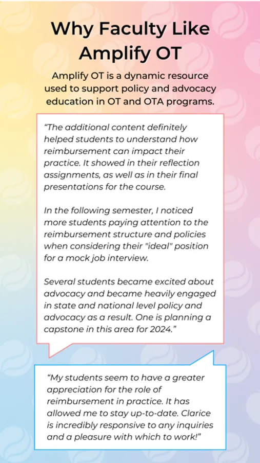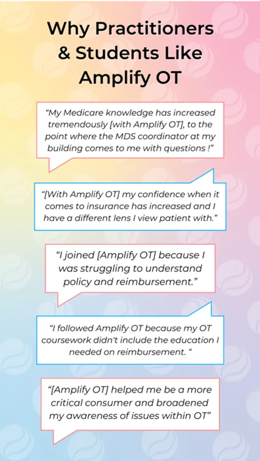 Amplify OT gives occupational therapy practitioners and students the tools you didn’t learn in school—but absolutely need in the real world. From Medicare policy to documentation, billing, and advocacy, this platform helps you turn confusion into clarity so you can thrive in today’s healthcare system.