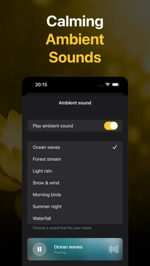 Immerse yourself in relaxation with a variety of calming ambient sounds. Whether unwinding or concentrating on your breathing, BoxMind provides the perfect audio backdrop.