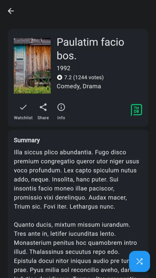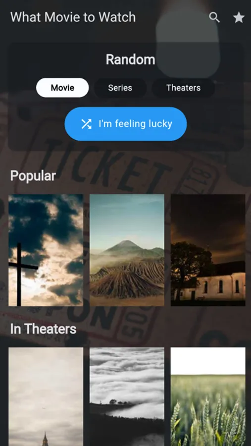 The idea is simple: You don't know what to see today? Just press the button and you will receive a random movie, TV series or a new movies in theaters. If you did not like the result, you can keep trying until a result that suits what you want to watch.