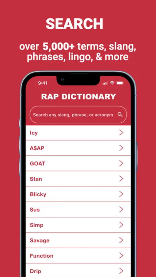 Continuously updated with 5,000+ terms & definitions used in Hip-Hop and Rap music, the RapDictionary.com dictionary app lets you look up & learn thousands of urban slang terms while improving your understanding of the culture. Optimized for both your iPhone and iPad.