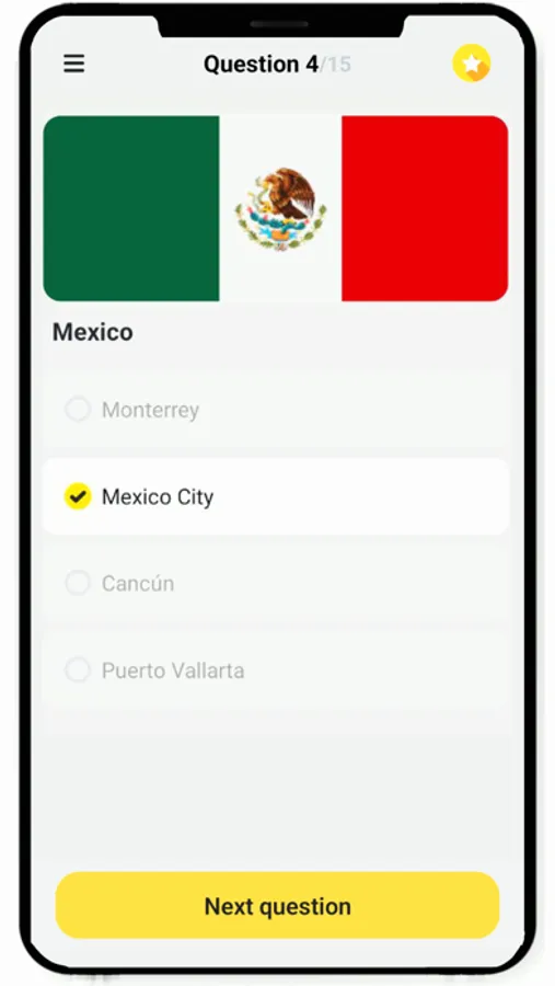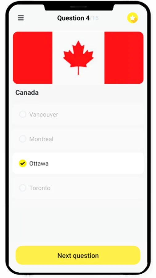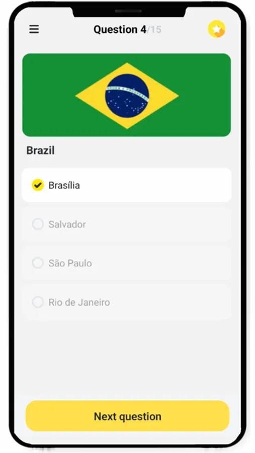- Comprehensive Database: Check your knowledge on countries, capitals, and flags with questions available in seven languages.