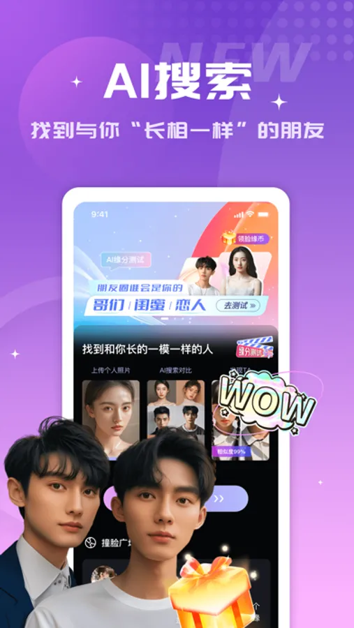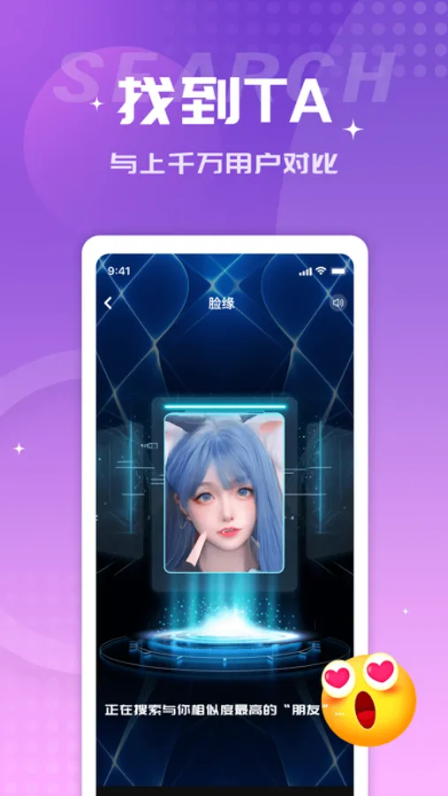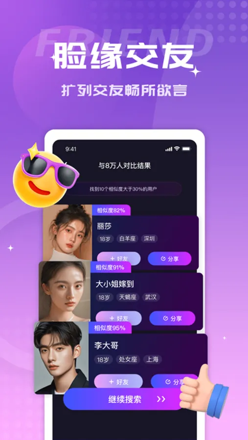 脸缘是一款非常有趣和实用的社交应用,它能够帮助你扩大社交圈子,结交新朋友,同时也能够让你更加了解自己的外貌特征。如果你想要寻找与自己长得相似的人,就来脸缘吧。