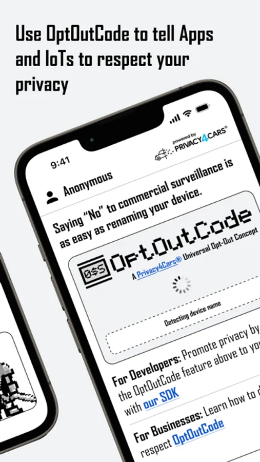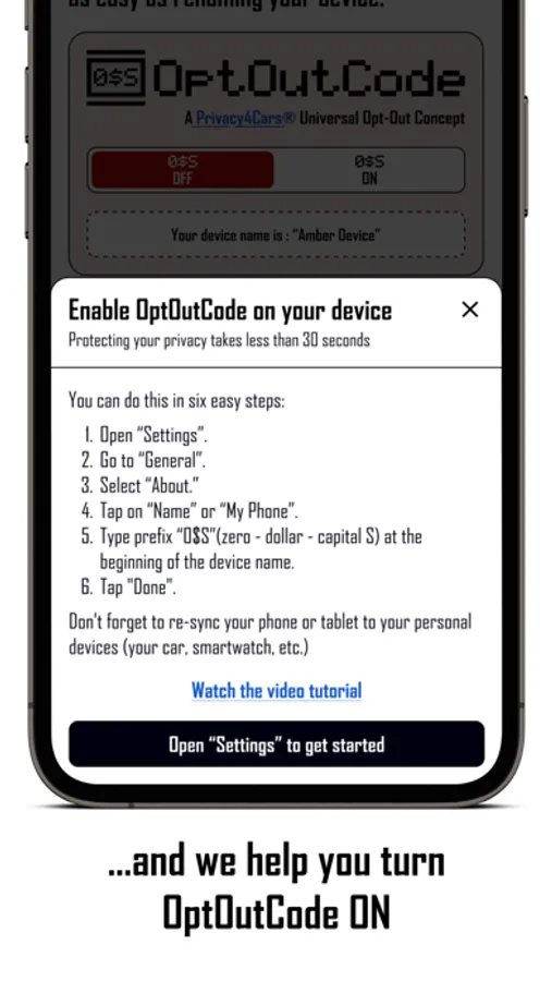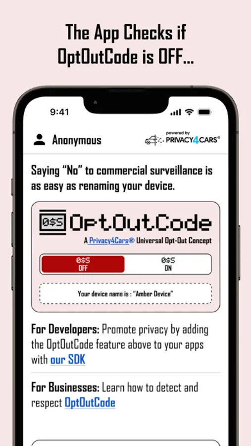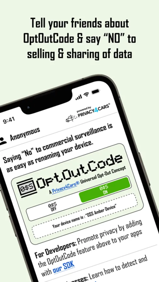 Saying “No” to commercial surveillance is as easy as renaming your device & our app makes it even easier! Invented by Privacy4Cars, OptOutCode is a new Universal Opt-Out Mechanism that only requires to add the prefix 0$S = Do Not (zero) Sell (dollar) or Share (capital letter S) as the first three letters of the name of consumers’ smartphones, computers, and wi-fi router. More info at https://optoutcode.com/