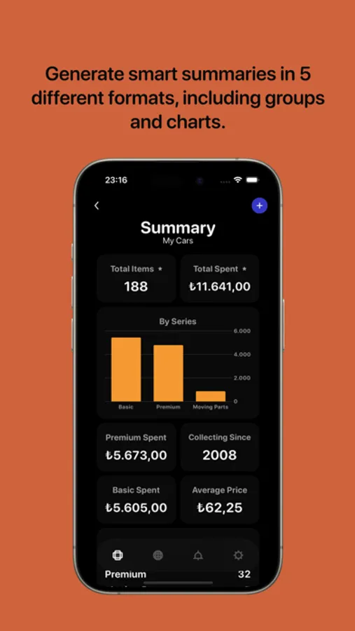 Track counts, such as Total Items, Total Items This Month, Total Premium Count, Total By Brands (e.g., Hot Wheels 123, Matchbox 132, etc.).