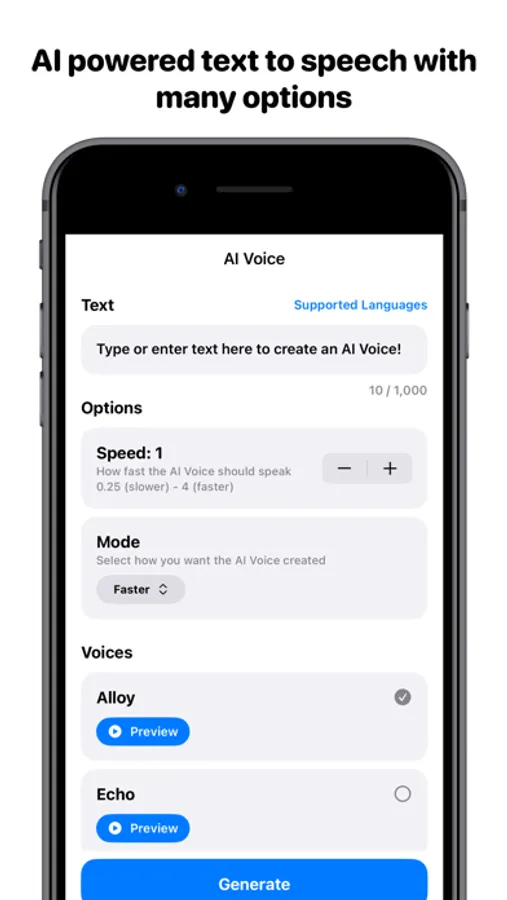 AI Voice is the perfect Text to Speech app. Using AI, AI Voice is able to create realistic sounding voices which are perfect for voiceovers.