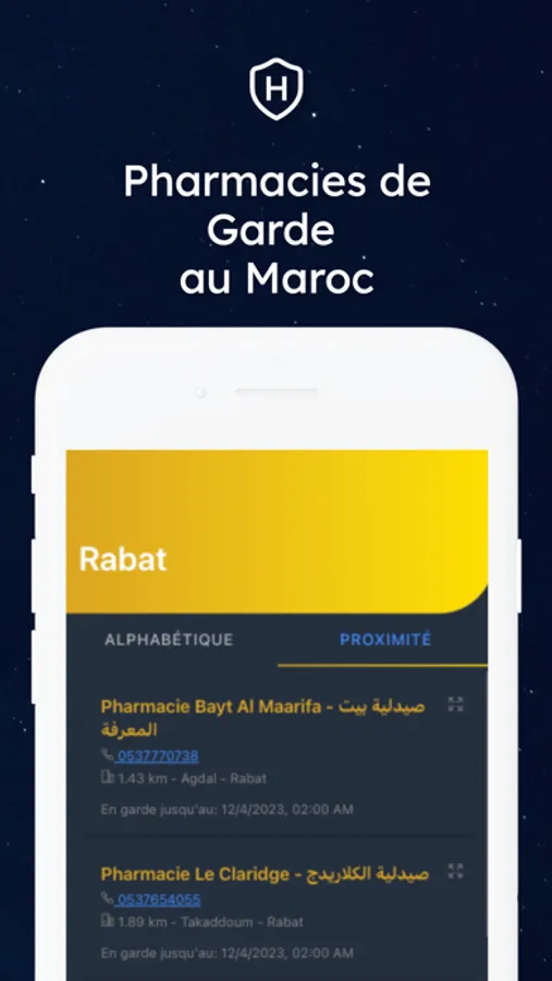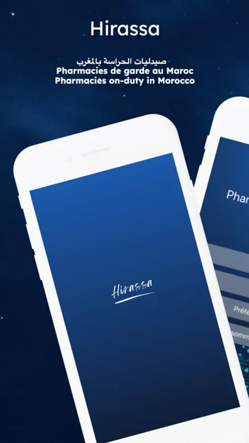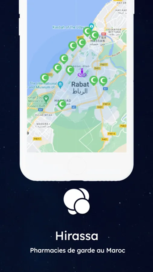Hirassa allows you to find the pharmacies that are on-duty nearby you. This is important because pharmacies in Morocco work regular hours, and only the on-duty ones work nights, weekends and holidays.