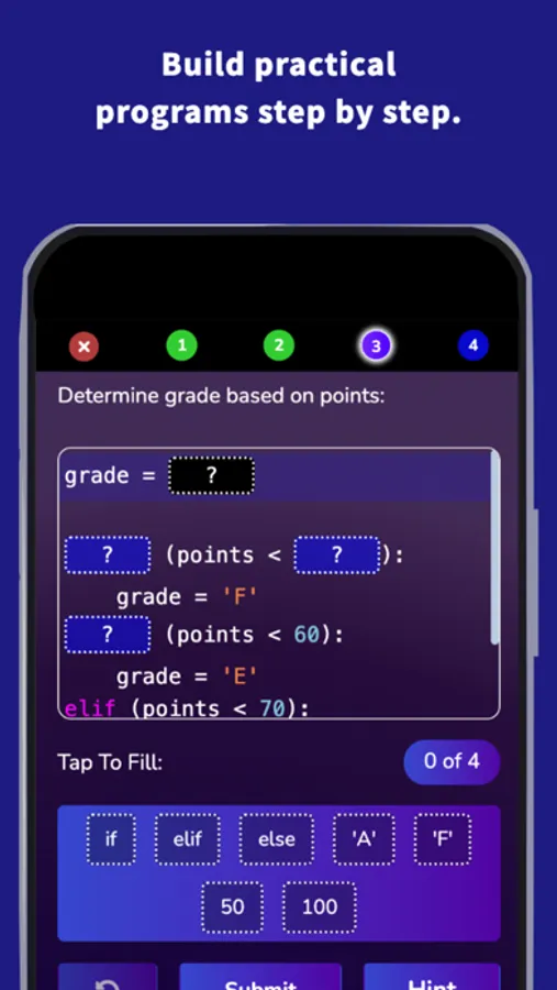 * Unlock all challenges and build problem solving Python programs step by step.