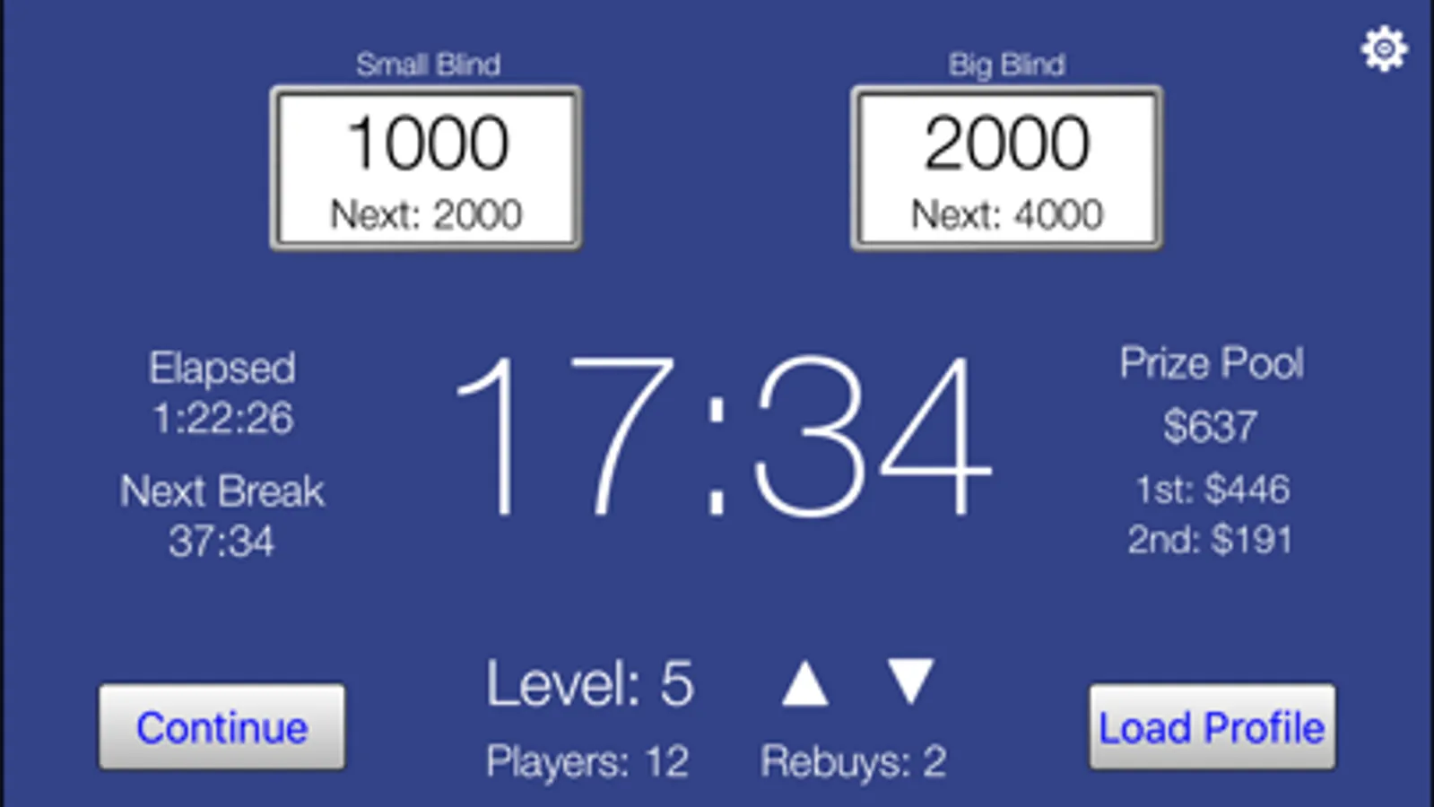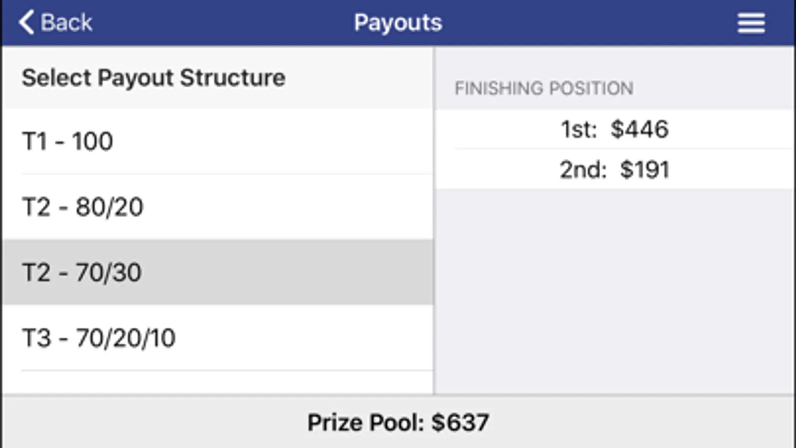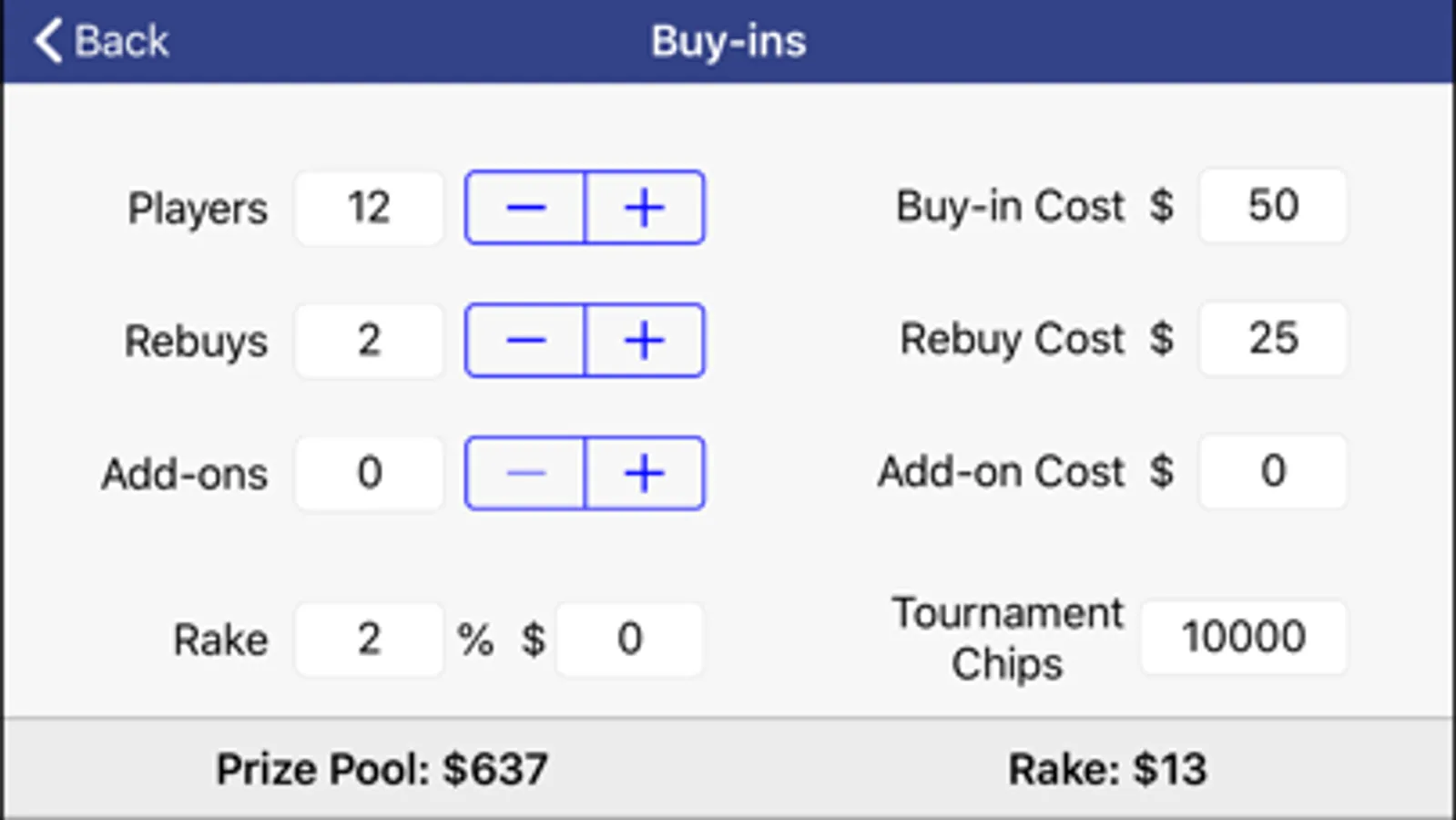 Automatically saves your customized tournaments for later use. Keeps a record of all buy-ins, rebuys and addons so you know the current total of the prize pool and calculates the payouts for the winners.