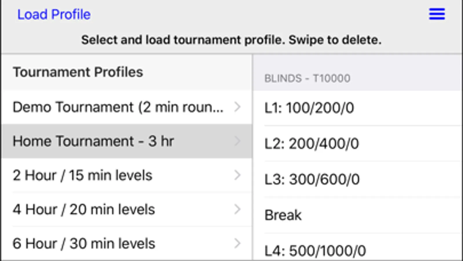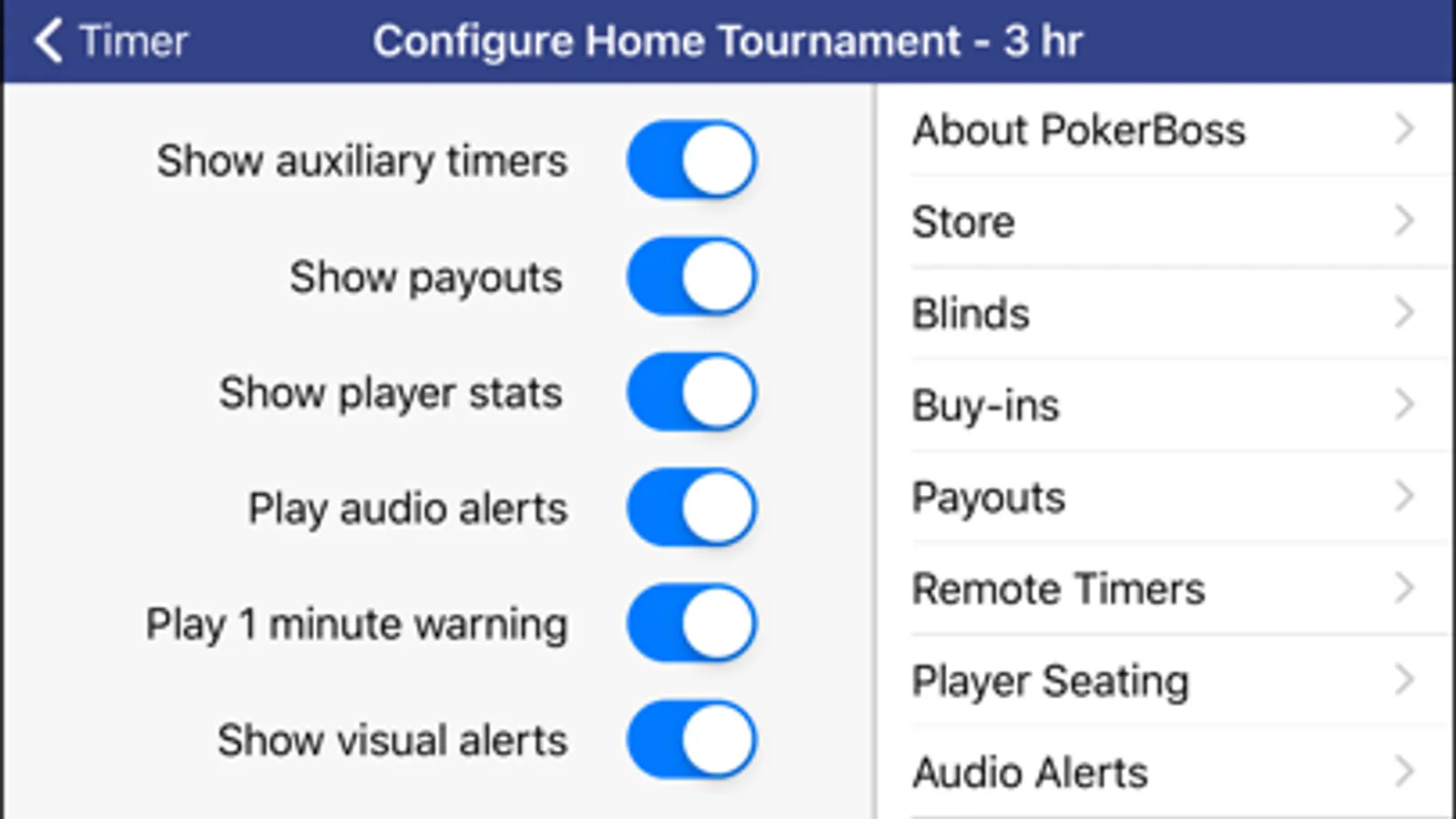PokerBoss Tournament Manager is just what you need to run your next home poker tournament or even a large multi-table tournament. A simple and clean interface allows you to easily see the timers at a glance. Support for Airplay (or HDMI adapters) allows the timer to be displayed on a big screen TV so everyone can see the timer for large tournaments.
