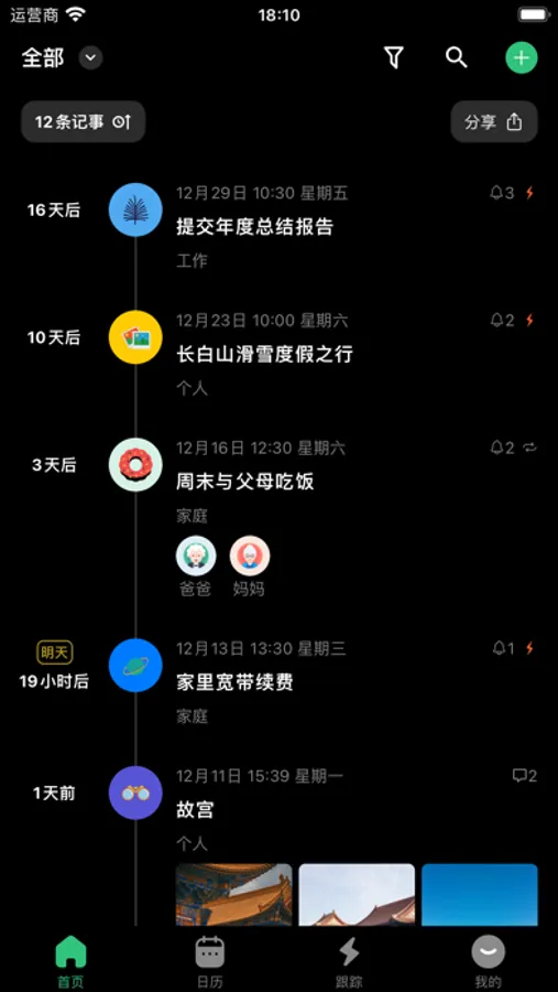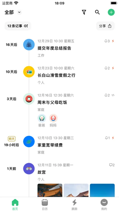 Homepage: Default display of timeline for all record items, allowing you to overview all important moments.