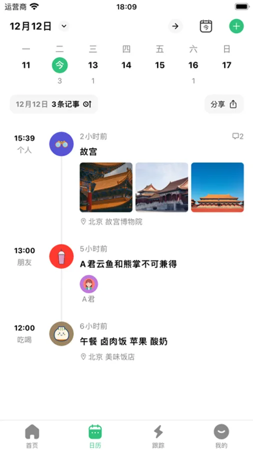 Calendar: Browse record items by day, swipe left or right to switch dates, presenting each day's record in a timeline format.