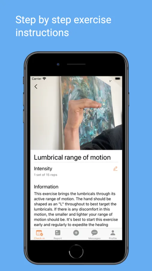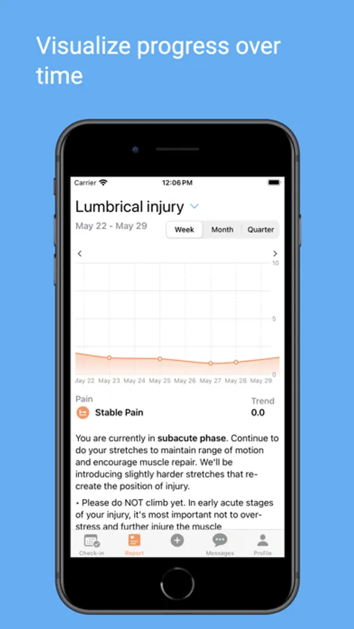 Patients can learn more about their injuries by selecting one of our pre-built rehab plans and choosing which exercises they'd like to do. Each day, Rehabbit will send reminders and schedule what exercises to do. For each exercise, we provide instructions and images, and also enable the patient to modify the intensity as needed (i.e, number of sets, reps weight). Over time, as patients use the app, they will be able to see their progress in Rehabbit. Charts indicating pain over time, exercises logged, and any modifications made during.
