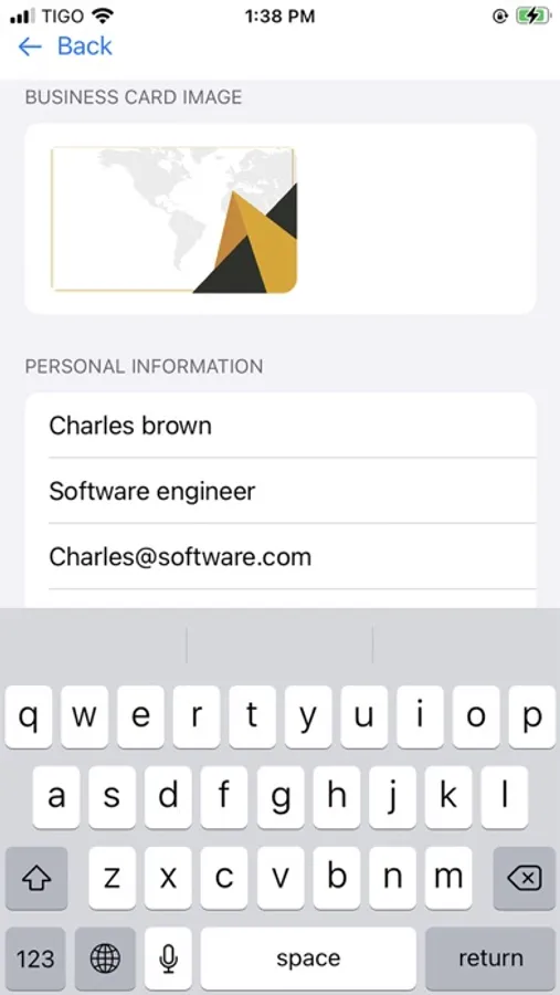 Inputting your information is a breeze. Simply fill in the fields with your details, and watch as the app transforms them into a sleek and polished digital business card.