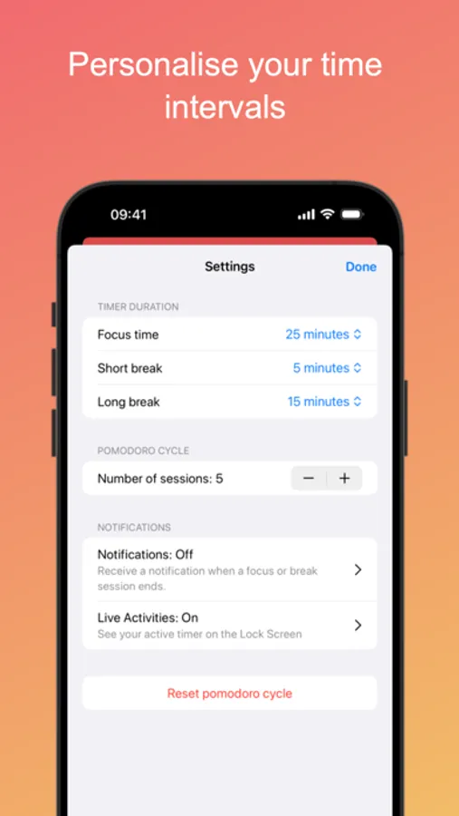 - Custom Themes: Personalise your timer with colours that inspire you.