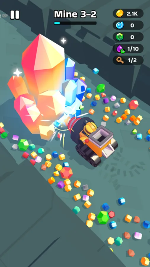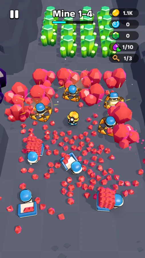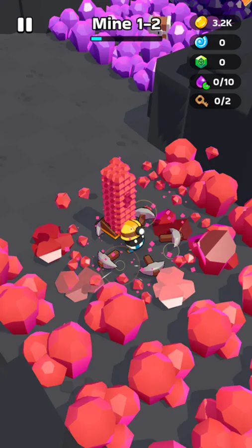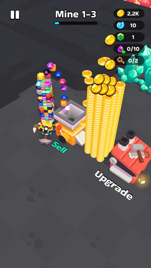 Break the ore with a rotating pickaxes, collect and sell gems, and become more powerful with upgrades.