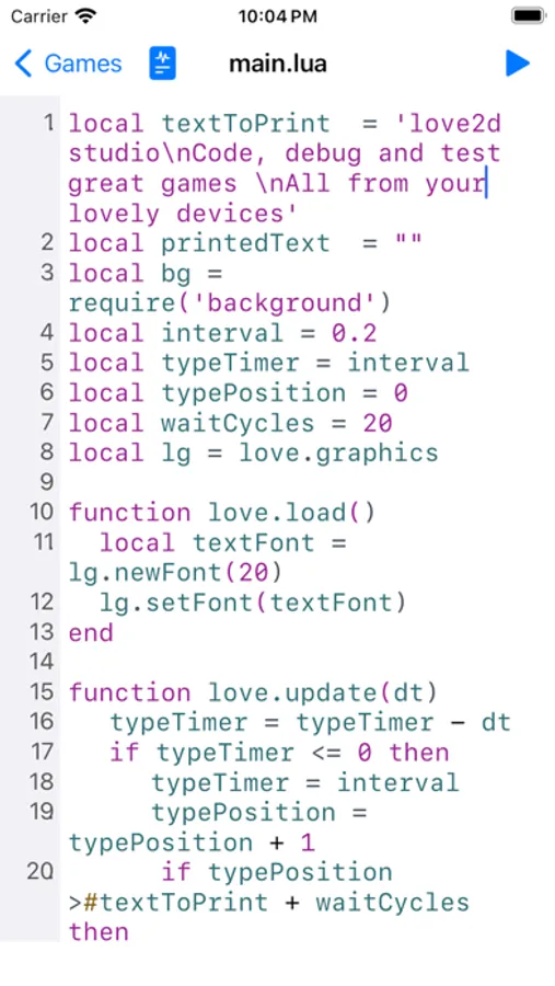 Love2D studio is an innovative tool help you code, debug and run games, all directly from mobile devices.