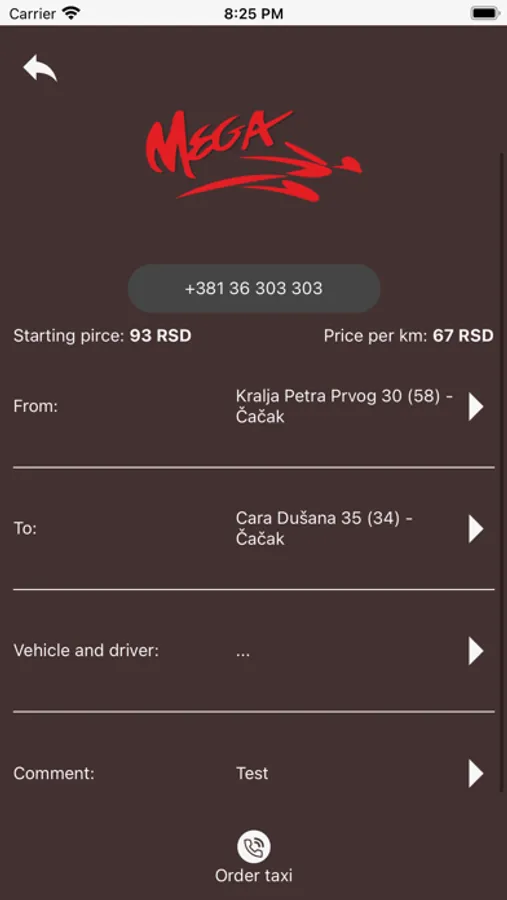 Aplikacija omogućuje naručivanje najbližeg taksi vozila uz mogućnost pregleda cene vožnje pre potvrde narudžbe. Program radi na Engleskoim i Srpskom jeziku.