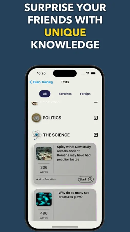 In just a couple of weeks, you will feel like a super-human with superpowers. This application will teach you how to think quickly and effectively, help you develop the speed of thought reaction, enrich you with new knowledge, significantly pump up your productivity, help you become an interesting interlocutor in any company.