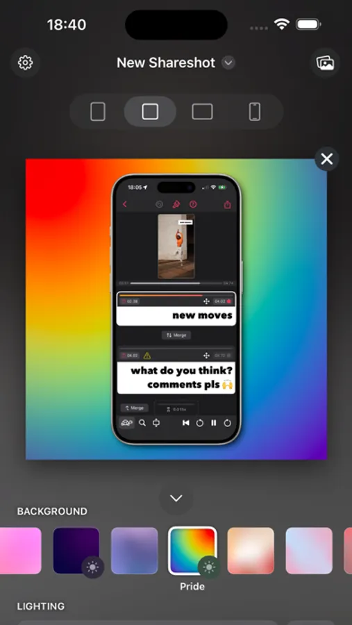 Shareshot is free to use with a watermark and some style limitations. Get a Pro subscription to remove restrictions and get full access to lighting controls, custom background images and custom frame support for the perfect screenshot! All bezels are included without paying.