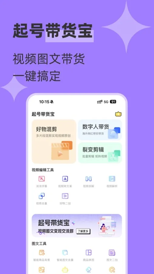 起号带货宝,为用户提供全面的起号以及视频图文带货功能,如好物视频混剪,视频去重,好物素材,商品拼图,ai抠图,闪图视频等,图文带货,视频带货利用启号图文宝,一键搞定,