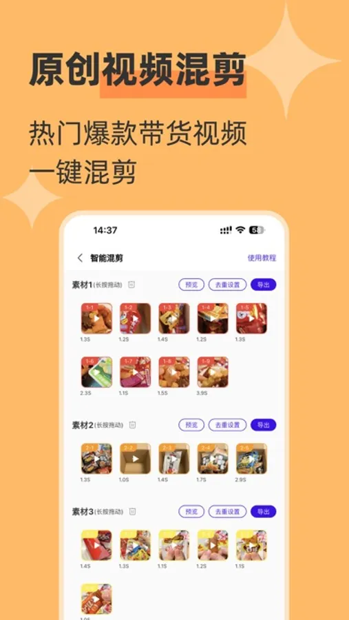 好物混剪:将多个热门爆款好物视频通过算法按镜头切分混剪,组合成新的爆款视频,零基础也能做爆款视频