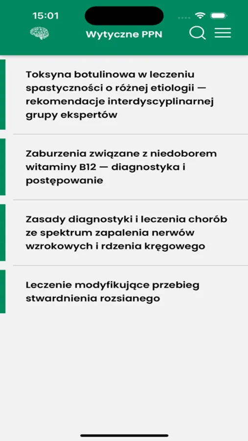 Aplikacja zawiera najważniejsze rekomendacje i zalecenia grup ekspertów, które opublikowały specjalistyczne artykuły w czasopiśmie „Polski Przegląd Neurologiczny”. Wśród najważniejszych wytycznych znalazły się rekomendacje poświęcone zastosowaniu toksyny botulinowej w leczeniu spastyczności, zasady diagnostyki i leczenia chorób ze spektrum zapalenia nerwów wzrokowych i rdzenia kręgowego, zalecenia dotyczące diagnostyki i postępowania w przypadku zaburzeń związanych z niedoborem witaminy B12, a także rekomendacje dotyczące leczenia modyfikującego przebieg stwardnienia rozsianego.