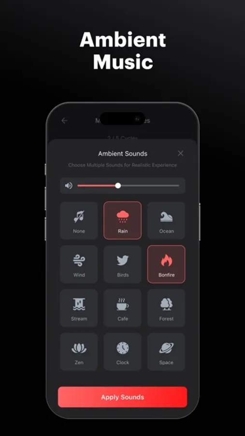 > Play multiple Ambient sounds at once: Currently our app has recordings of 15 different natural sounds, you can pick multiple For instance, you can play forest, thunderstorm, and bonfire. According to research, music of the right choice can boost focus by 30%.