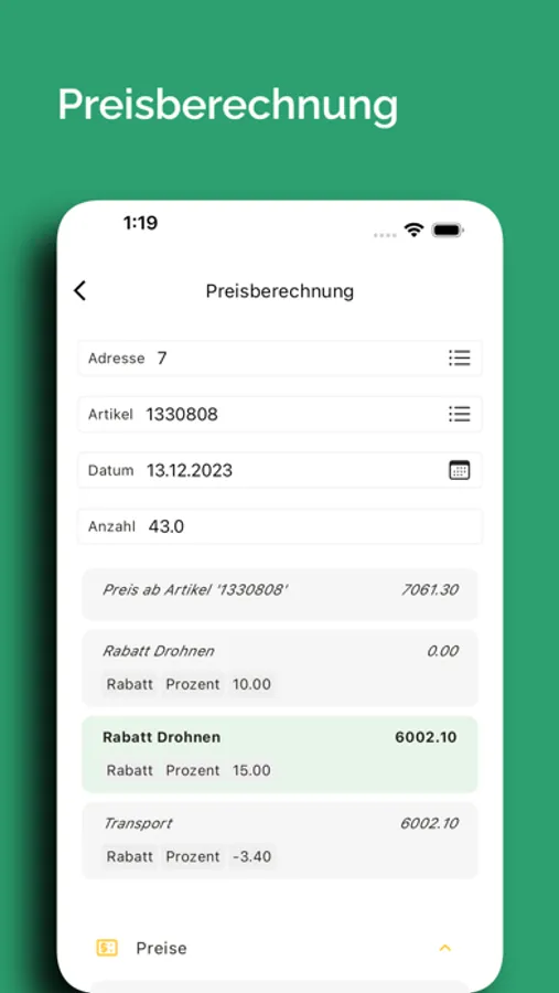 Komplexe Preisberechnungen aus der Proffix Preisverwaltung können direkt per App abgerufen werden. Pro Adresse, Artikel und mit entsprechenden Mengen.
