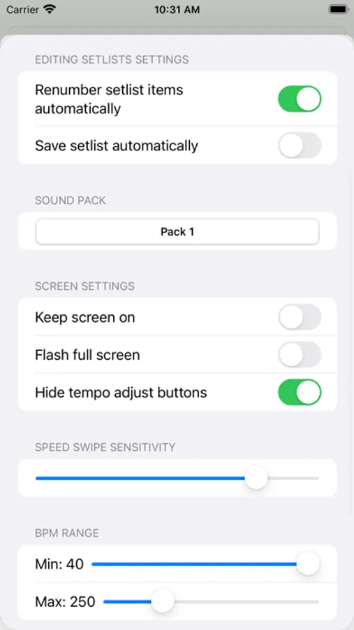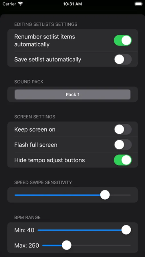 Ever wanted to practice your tempo precision skills as a musician, whether as a musical director, a pianist or guitar player? Easily create your setlists for your gigs and navigate through to practice individual tempi and tempo changes. You can use it live for an easy visual reference or when rehearsing. It is a matter of setting up your gig once and practising with low effort. A pro version is for sale with additional features (i.e. live mode, multiple sound packs, functionality to sharing setlists, and customization of the looks of the app).