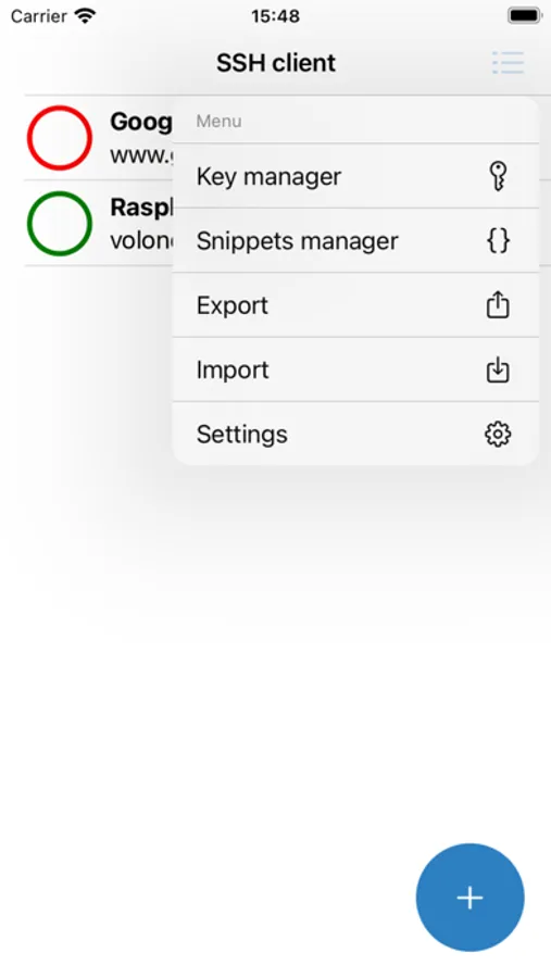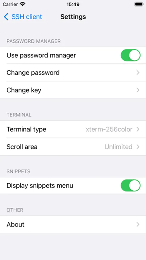 -Thanks to the built-in password manager, you do not have to keep in mind the passwords for each server and key. The password database is stored on the device and encrypted with AES256-CBC using the master key. You can manage the password manager or disable it altogether in the settings.