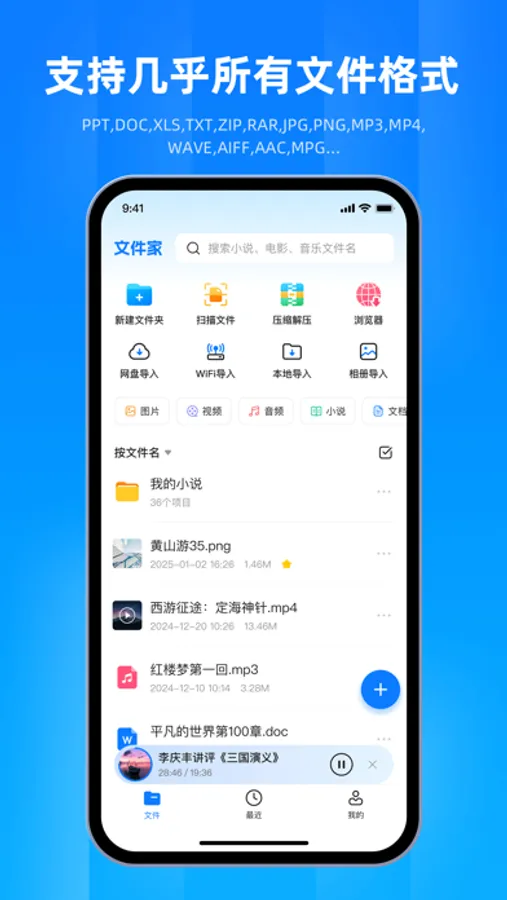 Core FeaturesBrowse: Allows you to quickly and easily view documents, play videos, and listen to music.Manage: Provides you with a rich set of operations to easily manage your local files.Supports multiple import methods: Method 1: Wi-Fi Transfer (connect your phone and computer to the same Wi-Fi, enter the URL, and import files with one click), Method 2: Cloud Drive Import (connect to your cloud drive and download files with one click), Method 3: Local Upload (upload files from your device with one click).