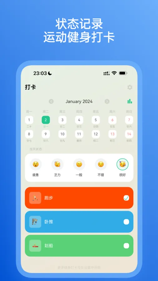 HeaFit also has a check-in feature that allows you to record your daily exercise and mood, keeping track of your daily workout progress.