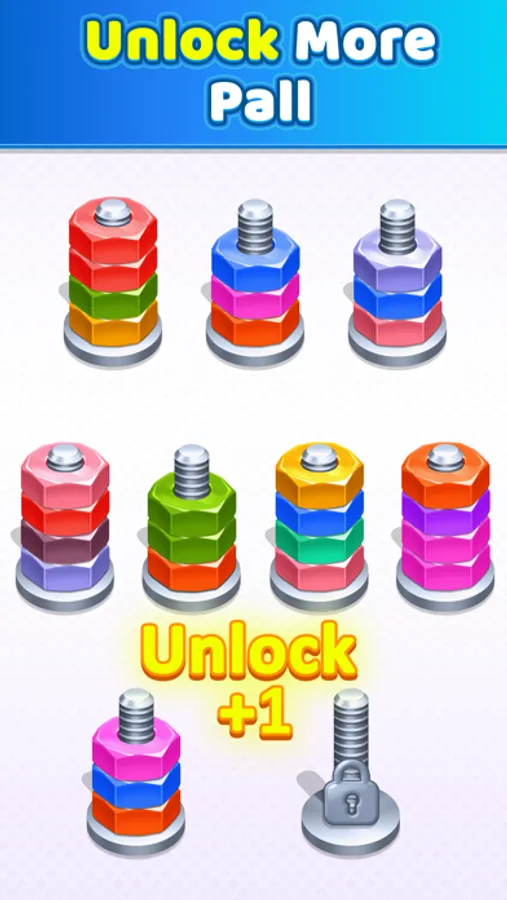 As you solve the coloring puzzle, the screw size will vary, going from three nuts to six nuts.
